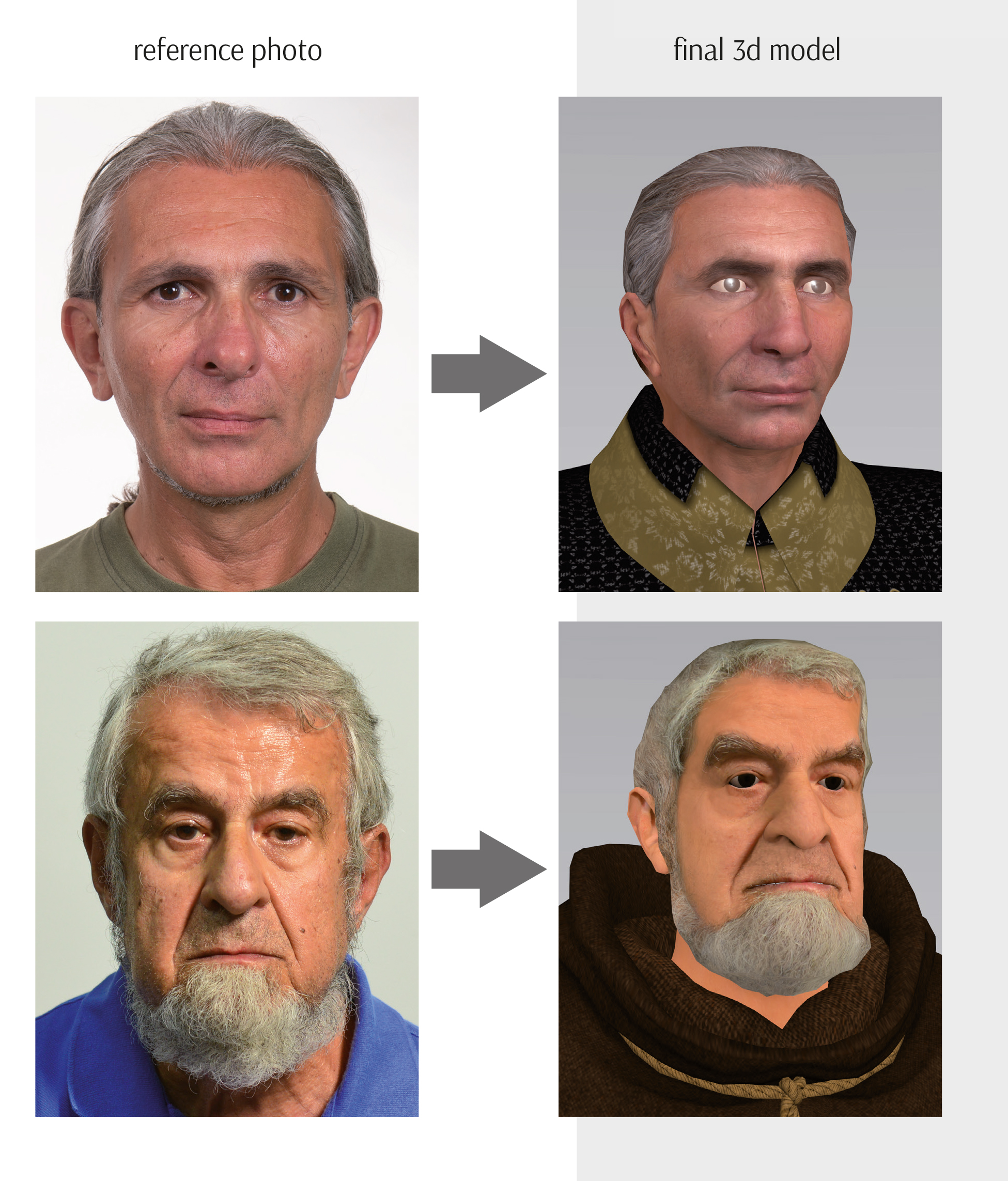 Casting & Morphing. Utilizzando riferimenti visivi e foto, il modello 3d viene ricostruito e dipinto con diverse tecniche. Il carattere risultante è molto realistico. I personaggi digitali del film sono cittadini di Noto prescelti in un casting accurato. Attraverso questi strumentii di Character Creation, si vuole rappresentare la transizione della Memoria emotiva (presente nella Comunità) nella personificazione digitale dei cittadini,dentro il racconto stesso.